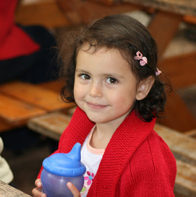 Olivia awaits her turn. Her classmate's tears have washed away most of his mustache!